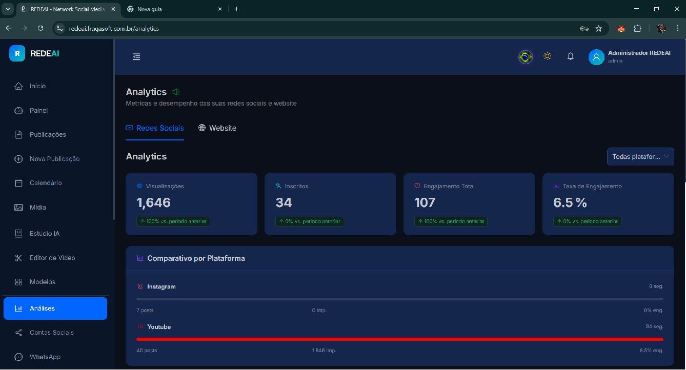 Dashboard com métricas em tempo real, relatórios de desempenho por rede social e integração com Google Analytics.
