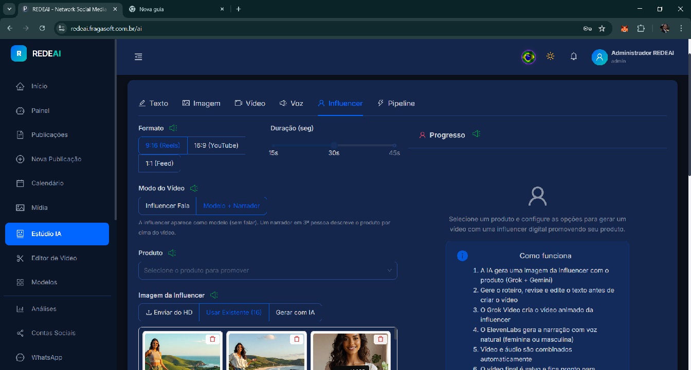 Estúdio IA — Crie vídeos com influencers virtuais usando Texto, Imagem, Vídeo, Voz e Pipeline