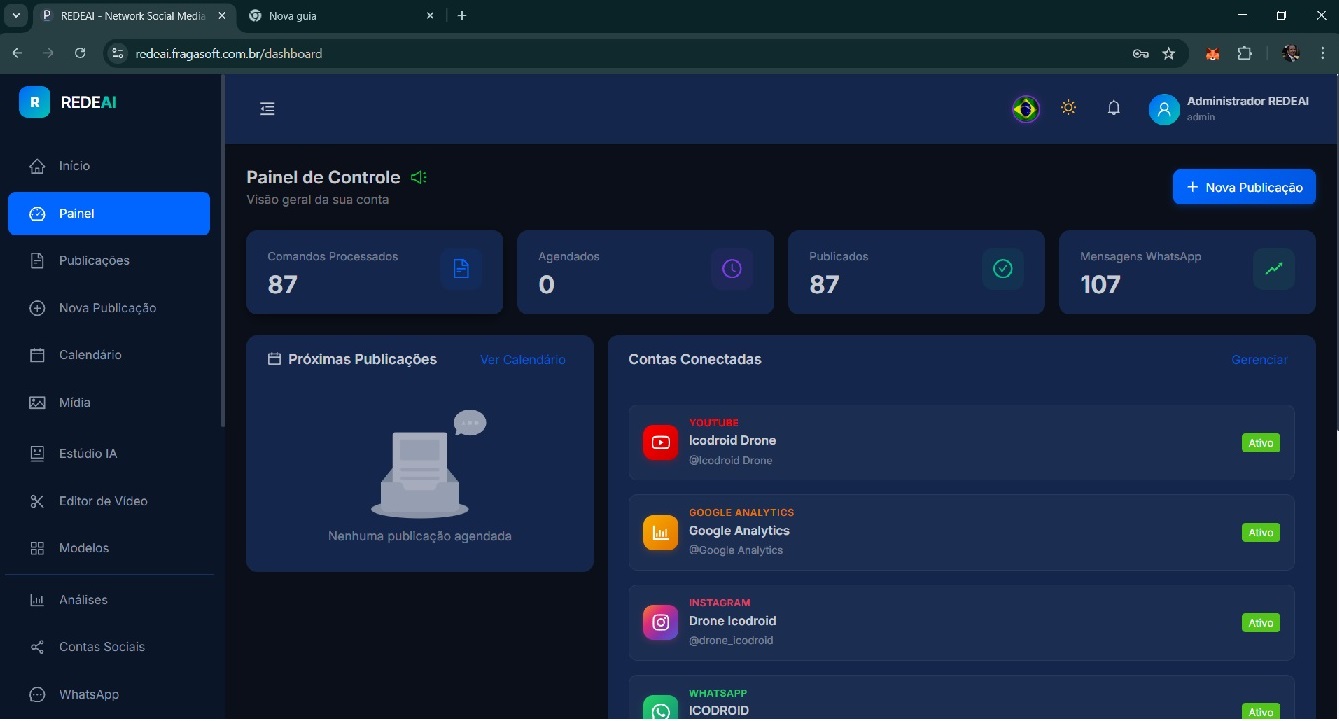 Crie posts, imagens, videos e vozes com IA. Automatize WhatsApp e e-mail. Gerencie todas as suas redes sociais em um so lugar.